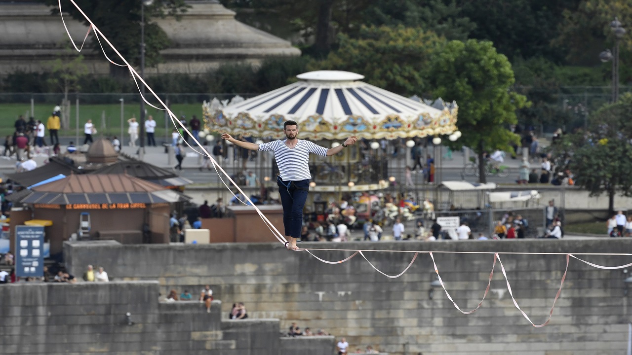 مشهد يحبس الأنفاس.. يعبر نهر السين مشياً على حبل مشدود من برج إيفل
