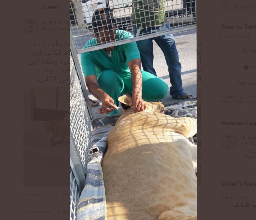 ونقل موقع "عاجل" عن المركز الوطني لتنمية الحياة الفطرية، في تغريدة عبر حسابه الرسمي في «تويتر»، إنه تم التعامل مع انثى الأسد وتخديرها ونقلها إلى مركز الإيواء تحت رعاية متخصصين وإشراف بيطري.