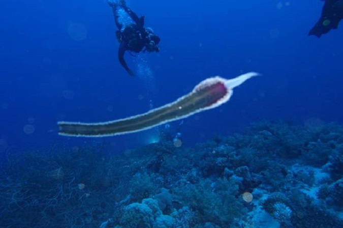 ظهر مخلوق غريب على شكل أنبوب بلا عيون أو آذان أو فم ما أثار ذهول وذعر الغواصين في أعماق البحر الأحمر.