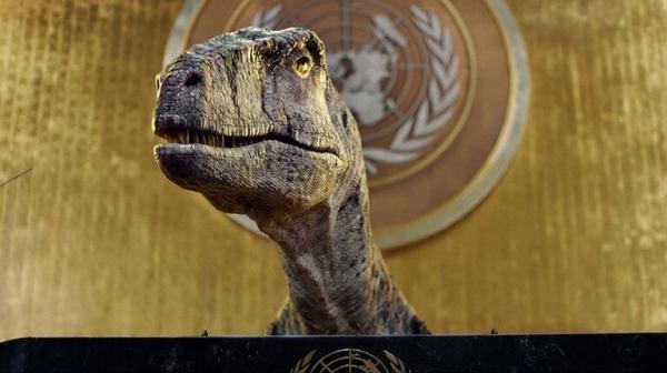 ديناصور يلقي كلمة على منبر الأمم المتحدة ويحذر المسؤولين: "الانقراض أمر سيىء" .. فيديو