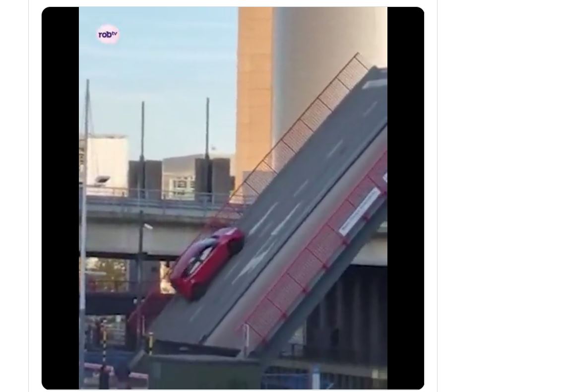 ووثق فيديو انتشر على منصات التواصل الادتماعي عالميا الحادثة وللحظة المرعبة التي ارتفع فيها الجسر وعلقت السيارة ومن فيها، على جسر في مدينة لوفين في 27 أكتوبر الجاري.