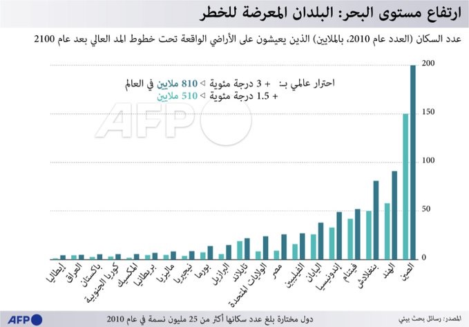 ووفق وكالة الأنباء الفرنسية تحتل الصين المرتبة الأولى من ناحية الأكثر تعرضا للخطر، تليها الهند، بنغلاديش، فيتنام، إندونيسيا، اليابان، الفلبين، مصر، الولايات المتحدة الأمريكية، بورما، نيجيريا، ماليزيا، بريطانيا، المكسيك، كوريا الجنوبية، باكستان، العراق وإيطاليا.