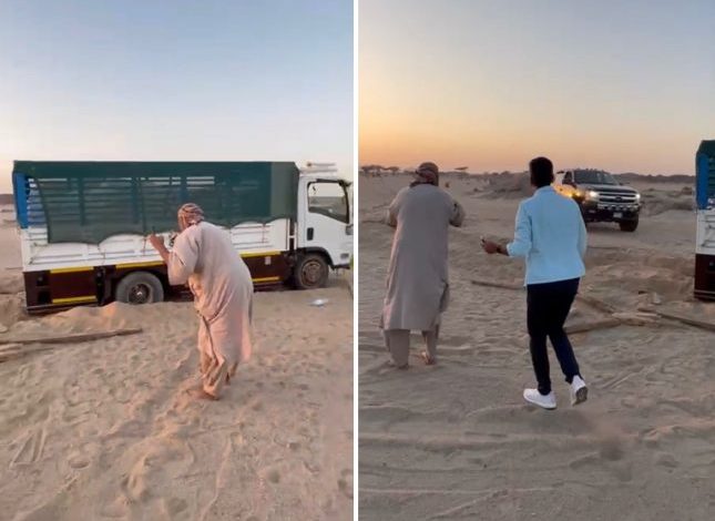 وكان قد أظهر الفيديو الأول الذي نشره السائق السوداني وهو يرصد لحظة توافد مركبات فرق الإنقاذ والمواطنين عليه، سعادته الشديدة عند مشاهدته سيارات فرق الإنقاذ لمساعدته، ليصرخ بصوته عالياً: “مرحب بالفزعة والله.. مرحب بالفزعة” وانهمرت دموعه.