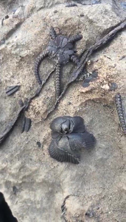 كما، بيّن أن من الأحافير التي عثر عليها أنواع مختلفة من الأصداف إضافة إلى الزنابق البحرية ونجم البحر، وقنافذ البحر، وبعض الكائنات البحرية التي لم يحدد نوعها من قبل المختصون في المساحة الجيولوجية.
