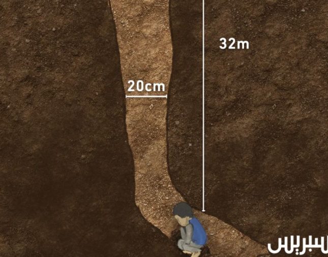 وبحسب الرسم التوضيحي المنشور على صحيفة هسبريس المغربية، فإن الطفل ريان متواجد في قاع البئر، على عمق 32 مترًا، علمًا بأن قطر فتحة البئر من الوسط تصل إلى 20 سم.