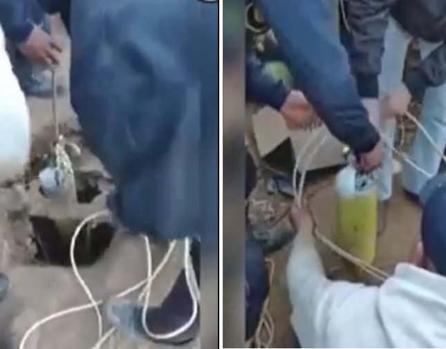 وتظهر الفيديوهات قيام رجال الإنقاذ بربط أنبوبة أكسجين وإنزالها داخل البئر إلى البؤرة المتواجد بها الطفل لتذويده بالأكسجين الكافي.