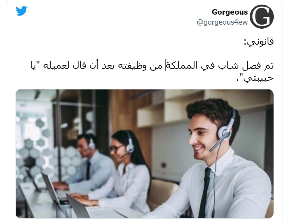 فصلت شركة عاملة في السعودية موظفا يعمل لديها في بقسم "خدمة العملاء" بعد أن قال لعميلة اتصلت هاتفيا للحصول على خدمة عبارة "يا حبيبتي"، مما دفعها للشكوى ضده في الشرطة واتهامه بأنه "تحرش بها".