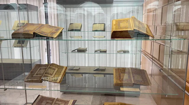 وتعد المصاحف المتحفية (20 مصحفًا) من أنفس المقتنيات، ومنها: مصحف شريف على شكل رول بطول 642,5×17,7م بحيث تتخلله آية الكرسي وشيء من الزخرفة بشكل مفرغ بطول الرول، وقد زيّن بزخرفة نباتية ملونة ومذهبة في بدايته ونهايته وكتب المتن داخل إطارين مذهبين ونسخة فخر الدين السهروردي سنة 1284هـ.