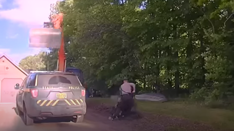أظهر مقطع فيديو التقطته كاميرا مراقبة مثبتة داخل إحدى السيارات التابعة لشرطة ولاية فيرمونت الأميركية محاولة رجل منع ضباط الشرطة من اعتقال ابنه، باستخدام الجرافة.