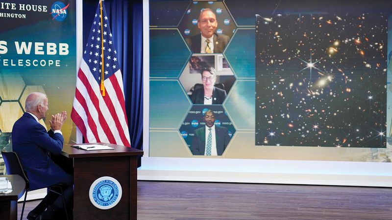 وقال الرئيس الأميركي جو بايدن، في حفل بالبيت الأبيض، وعرضت خلاله باكورة حصاد التلسكوب الفضائي، إنّ هذه الصورة العلمية والملوّنة، والتي التقطت بالأشعة تحت الحمراء هي الأولى من نوعها، وتمثّل يوماً تاريخياً.
