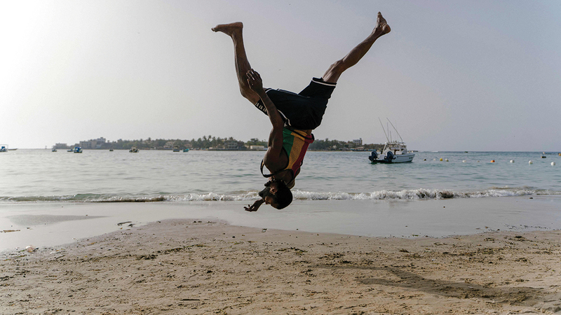 تدور مارييتو ثيام برشاقة داخل طوق هولا هوب معلّق خلال عرض تحييه فرقة «سينسيرك»، أول فرقة سيرك في السنغال، وإحدى الفرق النادرة في هذا البلد الإفريقي.