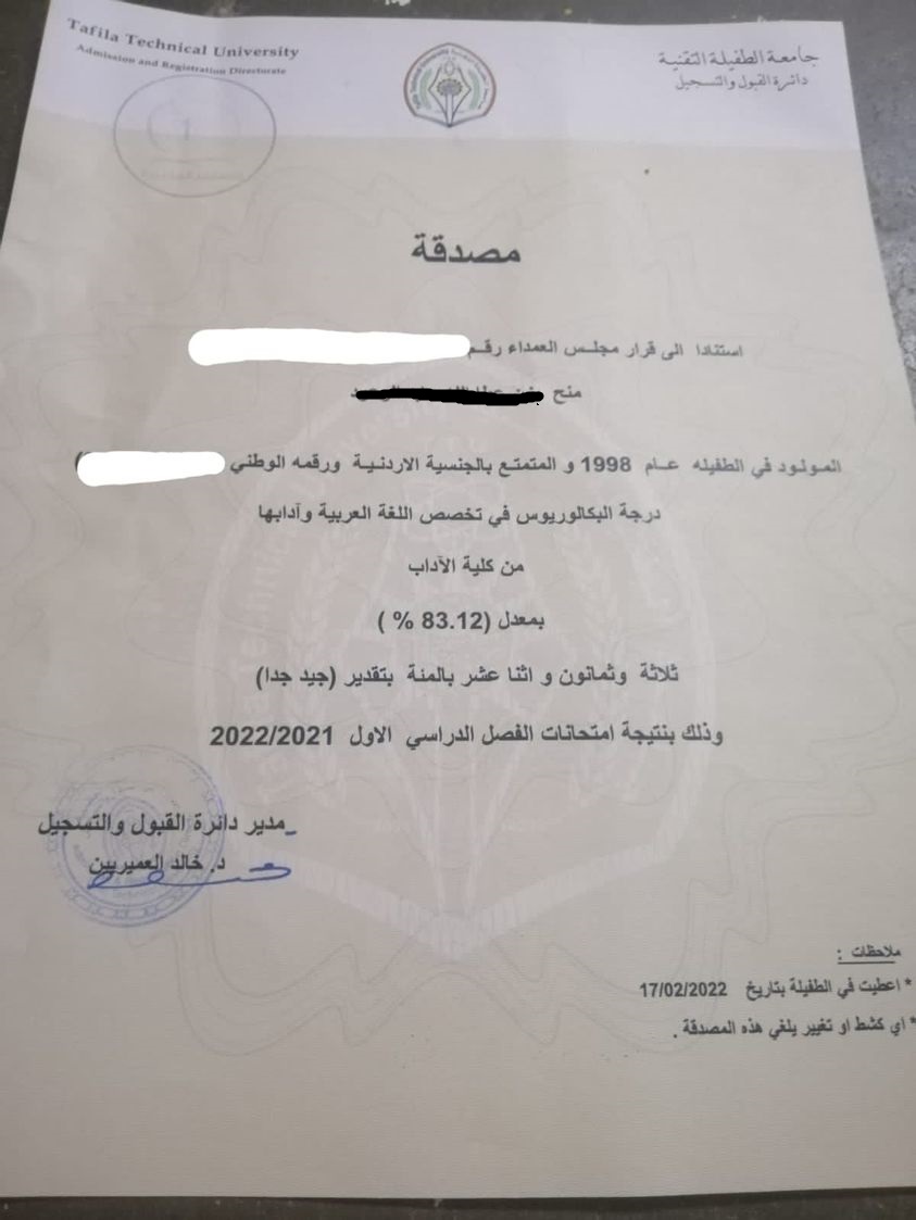 وبحسب الشهادة، فإن الخريج من طلبة كلية الآداب، تخصص لغة عربية، وقد حصل على معدل 83.12%.