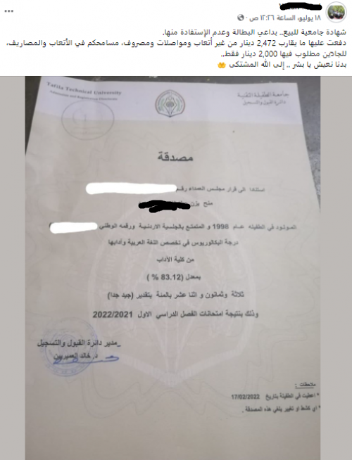 وقال الشاب وهو خريج جامعة الطفيلة التقنية "شهادة جامعية للبيع.. بداعي البطالة وعدم الإستفادة منها... دفعت عليها ما يقارب 2,472 دينار من غير أتعاب ومواصلات ومصروف، مسامحكم في الأتعاب والمصاريف، للجادّين مطلوب فيها 2,000 دينار فقط.. بدنا نعيش يا بشر .. إلى الله المشتكى"