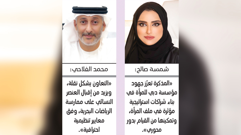 وقالت شمسة صالح إن «المذكرة تأتي في إطار مبادرات مؤسسة دبي للمرأة لترجمة رؤية وتوجيهات حرم سموّ الشيخ منصور بن زايد آل نهيان، نائب رئيس مجلس الوزراء وزير ديوان الرئاسة، سموّ الشيخة منال بنت محمد بن راشد آل مكتوم، رئيسة مجلس الإمارات للتوازن بين الجنسين رئيسة مؤسسة دبي للمرأة ورئيسة نادي دبي للسيدات، بتقديم كل أشكال الدعم للمرأة في مختلف القطاعات، بما في ذلك تشجيعها على ممارسة الرياضة بمختلف مجالاتها، وتأهيلها للمشاركة في الفعاليات الرياضية البحرية المحلية والعالمية، كما تأتي انطلاقاً من توجيهات سموّها بتكريس كل إمكانات نادي دبي للسيدات لإنجاح الفعاليات الرياضية الخاصة بالمرأة، وتعزيز ريادة النادي في هذا المجال».