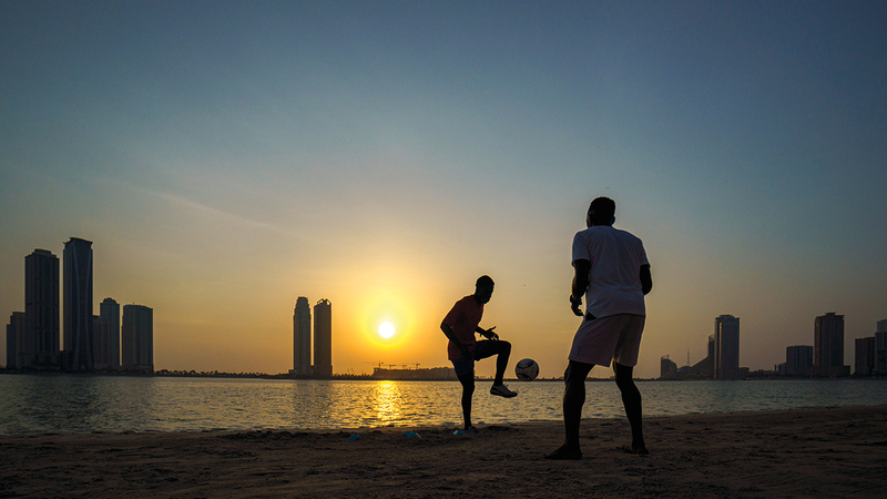 مع ساعات الغروب يتحول شاطئ بحيرة خالد في الشارقة إلى ملتقى لعشاق الرياضة وممارسة التمارين، ويستغل المرتادون انخفاض درجات الحرارة لممارسة رياضاتهم وأنشطتهم البدنية المفضلة، من تمارين كرة القدم إلى الجري والكرة الطائرة، وغيرها من الألعاب.