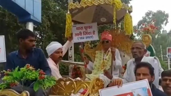 توجه رجل هندي إلى أحد المكاتب الحكومية مرتدياً بزة عرس ومعه عربة قديمة ومجموعة موسيقيين يؤدون أنغاماً على آلات نفخ نحاسية، لكي يثبت للسلطات الهندية التي توقفت عن دفع معاش تقاعدي له أنّه لا يزال حياً رغم بلوغه عامه الثاني بعد المئة.