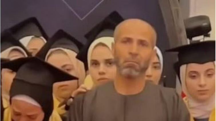 وأظهر الفيديو الأب الذي يُدعى عمر محمد عصفور، وسط زميلات ابنته الطالبة الراحلة أمينة، التي تُوفيت قبل أيامٍ قليلة من الحفل، بحسب ما تمّ تداوله على مواقع التواصل الاجتماعي.