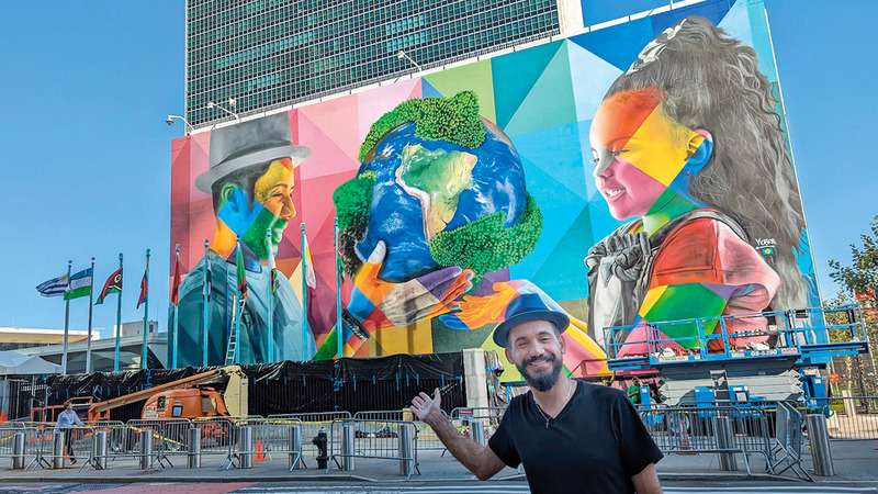أزيح الستار عن جدارية جديدة على جدار مقر الأمم المتحدة في نيويورك بالتزامن من اجتماعات الجمعية العامة. ويُظهر العمل الذي تبلغ مساحته 350 متراً مربعاً للفنان البرازيلي إدواردو كوبرا عالماً يركز على أميركا الجنوبية. وقال كوبرا إن الجدارية تصور أباً يقدم هدية لابنته، ما يعكس ما يأمل أن يكون إرثاً جديداً من الرعاية للبيئة. ونقلت الأمم المتحدة عن كوبرا: «الرسالة تدور حول الكوكب الذي نسلمه لأجيالنا المقبلة. كيف نعتني بكوكبنا؟ لأن المستقبل هو الآن. لقد بدأ المستقبل بالفعل، ونحن جميعاً مسؤولون عنه».