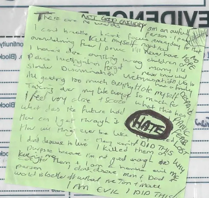 وكتبت ليتبي، البالغة من العمر 32 عاماً، في مذكرة خضراء وجدت بحوزتها وتم عرضها على المحكمة: "أنا لا أستحق الحياة.. لقد قتلتهم عن قصد لأنني لست جيدة بما يكفي".
