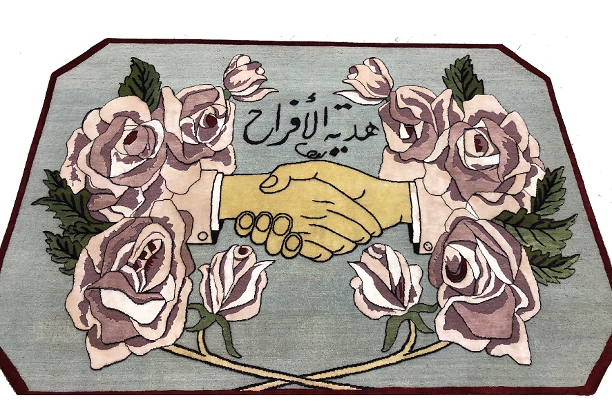 عفراء وشيخة بن ظاهر من دولة الإمارات العربية المتحدة تقدمان "التغرودة" في أسبوع دبي للتصميم من خلال 3 قطع سجاد أرضية، بالإضافة إلى أخرى معلّقة على الحائط.