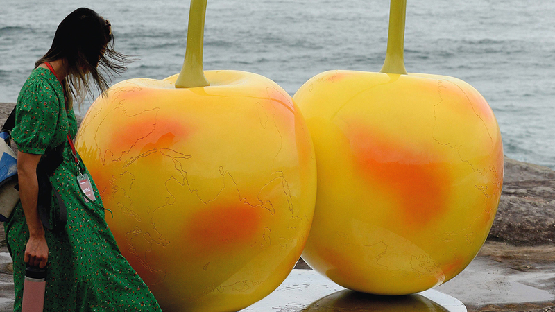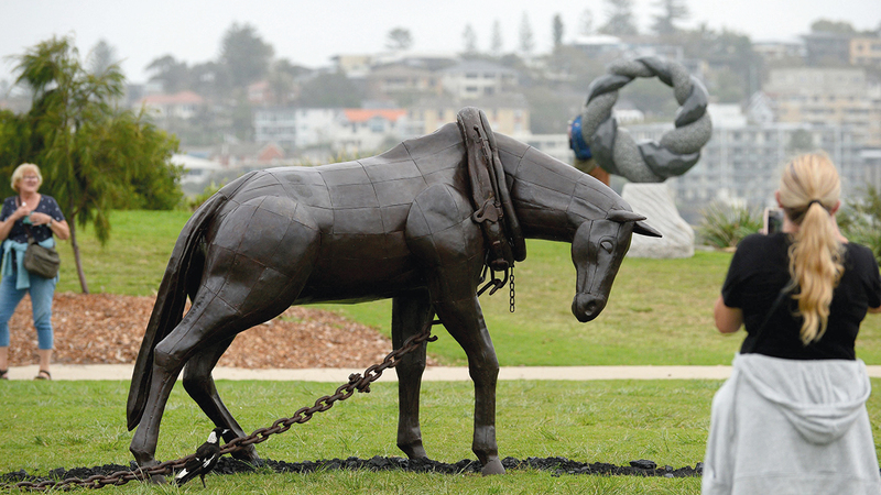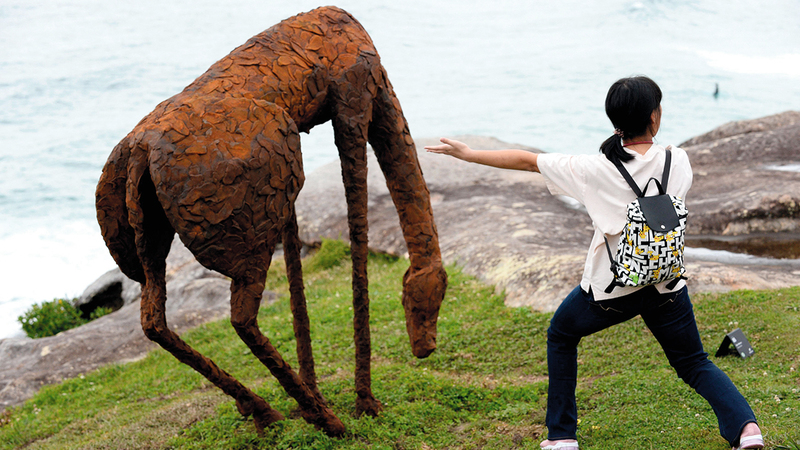 زوّار يلتقطون صوراً مع تماثيل ومنحوتات فنية معروضة على شاطئ بوندي وتماراما، كجزء من معرض «النحت بجانب البحر»، الذي نظم أخيراً، في مدينة سيدني الأسترالية.