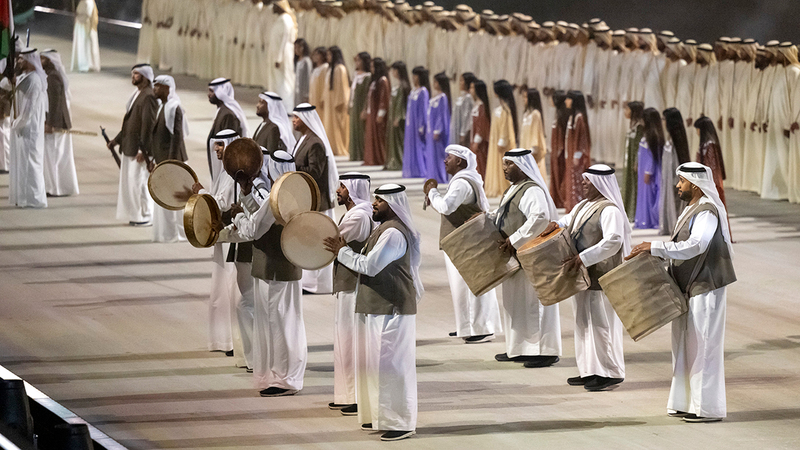 على مسرح صمم بشكل أسطواني، ويمثل نفق العبور من الماضي إلى المستقبل، تجسيداً لمسيرة وإنجازات الإمارات، أقيم أمس، الاحتفال الرسمي لعيد الاتحاد بتنظيم لجنة الاحتفالات في مركز أبوظبي الوطني للمعارض.