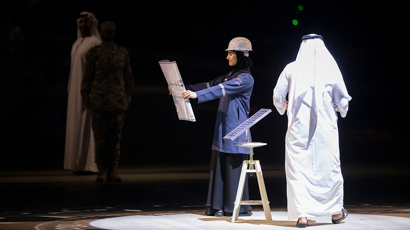 روى العرض الذي دامت مدته ساعة، حكاية وإنجازات الدولة التي بدأت من عام 1971، دون أن يتوقف عند الحاضر، بل استكمل الحكاية بالتطلع نحو المستقبل والجيل الواعد الذي سيتابع مسيرة الدولة المكللة بالنجاح والإنجازات، مركزاً على قطاعات أساسية وهي الحياة البحرية والزراعية، والطاقة المتجددة، والفضاء والتعليم.
