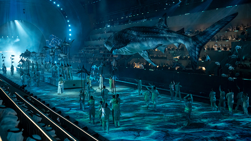 ومن حكاية المواطن انتقل العرض إلى القطاعات الواعدة التي تركز عليها الإمارات في مسيرتها، وهي الحياة البحرية والزراعية والفضاء والطاقة المتجددة والتعليم. وحملت كل فقرة من فقرات العرض حكاية ملهمة، فكانت البداية مع الحياة البحرية وقصة العالمة البحرية نورة المنصوري، التي اصطحبت الحضور برحلة إلى أعماق المحيطات. جمعت الفقرات بين الأسلوب السردي، والتقنيات الحديثة في استخدام الشاشة على المسرح والليزر والمجسمات التي أوجدت مشاهد متكاملة العناصر المبهرة. فتحت الشاشة على صور البحار، وأحيلت أرضية المسرح إلى مياه عميقة، فدخلت بعدها المجسمات للكائنات البحرية التي صنعت من قبل حرفيين محليين في الإمارات، في مشهد ثلاثي الأبعاد، حمل جماليات توازي عمق الرسالة.