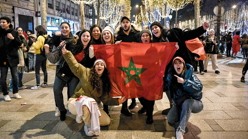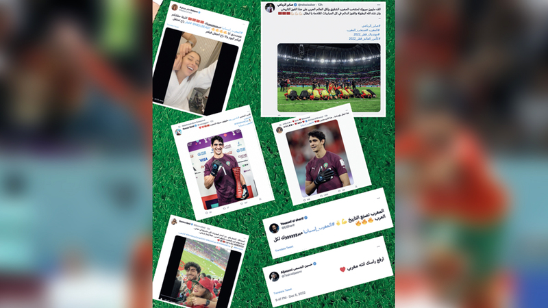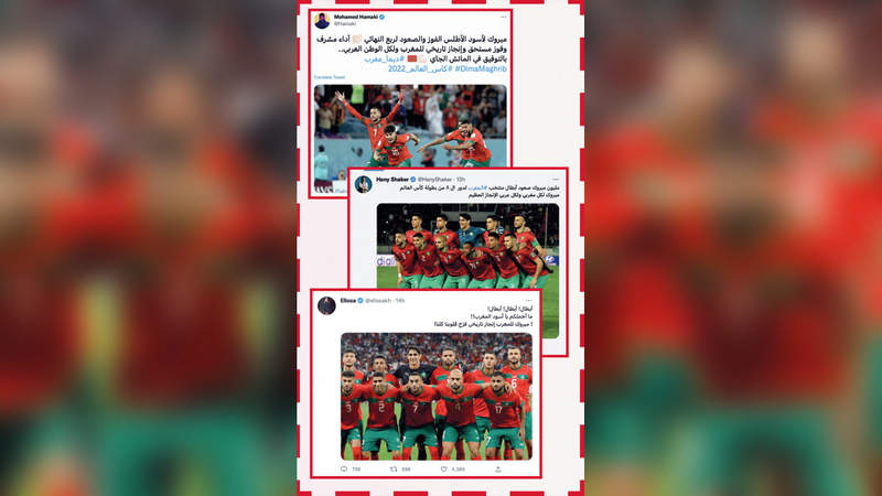 الفرحة الكبيرة بفوز «أسود الأطلس»، سرعان ما انعكس صداها لدى نجوم الفن والغناء والمشاهير العرب، الذين حرصوا، كلٌ من موقعه، على أن يقتسموا فرحة المغاربة العارمة وفخرهم بفوز بلادهم، ويكونوا جزءاً فاعلاً من موجات الاحتفاء العام بهذا الإنجاز الرياضي الكبير على المنصات الرقمية، معبّرين، كلٌ بطريقته، عن ألق هذا الفوز، ومفاجأة التأهل، متمنين التوفيق لـ«أسود الأطلس» لمتابعة مشوار نجاحاته القادمة، ورسم البسمة على وجوه العرب في هذا العرس الكروي العالمي.