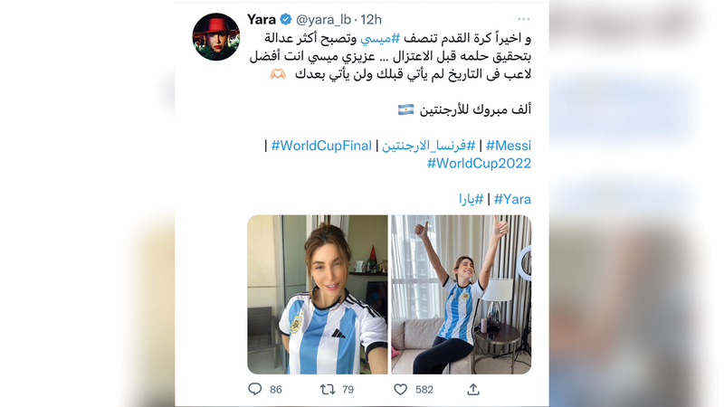 ولم تفوت الفنانة يارا الفرصة للتعبير عن فرحتها العارمة بفوز فريقها المفضل، وهي التي سبق أن عرفت بتشجيعها الدائم لليو ميسي، إذ ارتدت القميص الرسمي للفريق الأرجنتيني، وعلقت عبر «تويتر» و«إنستغرام»: «وأخيراً كرة القدم تنصف ميسي، وتصبح أكثر عدالة بتحقيق حلمه قبل الاعتزال». وأضافت مخاطبة النجم الأرجنتيني: «عزيزي ميسي، أنت أفضل لاعب في التاريخ، لم يأت قبلك، ولن يأتي بعدك... ألف مبروك للأرجنتين».