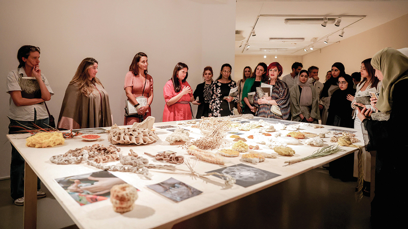 وتحدثت باولا أنزيكه عن معرضها لـ«الإمارات اليوم»، وقالت: «بدأت بهذا المشروع منذ أربع سنوات، عندما دعيت من قبل (لورو بيانا) للعمل على الأقمشة والخيوط، وبشكل خاص على خيوط الصوف الطبيعية، وصلت إلى الإمارات وبدأت بدراسة التاريخ الخفي في الدولة، فالبحث هو نقطة البدء في عملي». وأضافت: «زرت في البدء الأماكن التي تعتبر غير مرئية كثيراً في المدينة، من بينها المواقع القديمة في منطقة جميرا، ووجدت أن هناك مشهدين متواجهين، وهما الأماكن القديمة مع الحديثة، ولهذا ركزت في عملي على التفاصيل الصغيرة، كما زرت مدينة العين، ورأس الخيمة، والسبخة، وجمعت منها الكثير من العناصر الطبيعية، مع استخدام الأقمشة الخاصة بـ(لورو بيانا)».