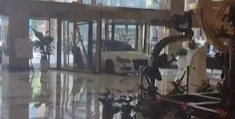 صيني غاضب يقتحم بهو فندق بسيارته فما هو السبب ؟ (شاهد الفيديو)