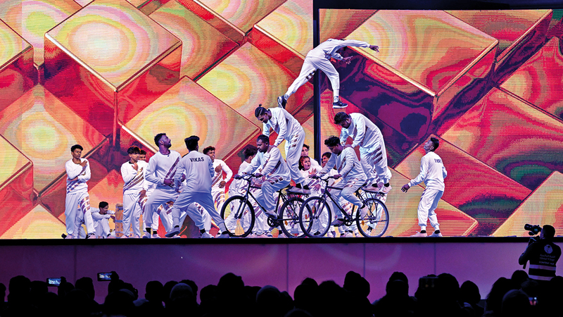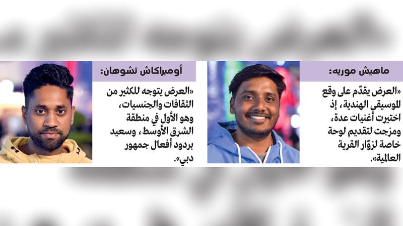 وقال المدير التنفيذي والإبداعي في الفرقة، ماهيش موريه، لـ«الإمارات اليوم» عن العروض التي تقدم على خشبة المسرح الرئيس بالقرية العالمية حتى 30 الجاري: «يعتبر العرض الذي يقدم في القرية العالمية، من أطول العروض التي قدمتها الفرقة منذ انطلاقها، إذ يمتد إلى ما يقارب 20 دقيقة، ويُعد طويلاً نظراً لصعوبة ما تقدمه الفرقة، إذ يجمع بين الرقص والأكروبات»، مشيراً إلى أن العرض يقدم على وقع الموسيقى الهندية، إذ اختيرت أغنيات مجموعة من أهم الفنانين، ومنهم شاروخان وسلمان خان، ومزجت مع بعضها لتقديم لوحة خاصة لزوار القرية العالمية، وتراوح أعمار الراقصين ما بين 15 و38 سنة. وحول مسرح القرية العالمية، أضاف أنه مناسب جداً، ويتسع لعدد الراقصين الكبير، كما أن من ميزاته الإيجابية لهذا النوع من العروض هو الإضاءة المبهرة والتي تضيف إلى ألق الرقص.