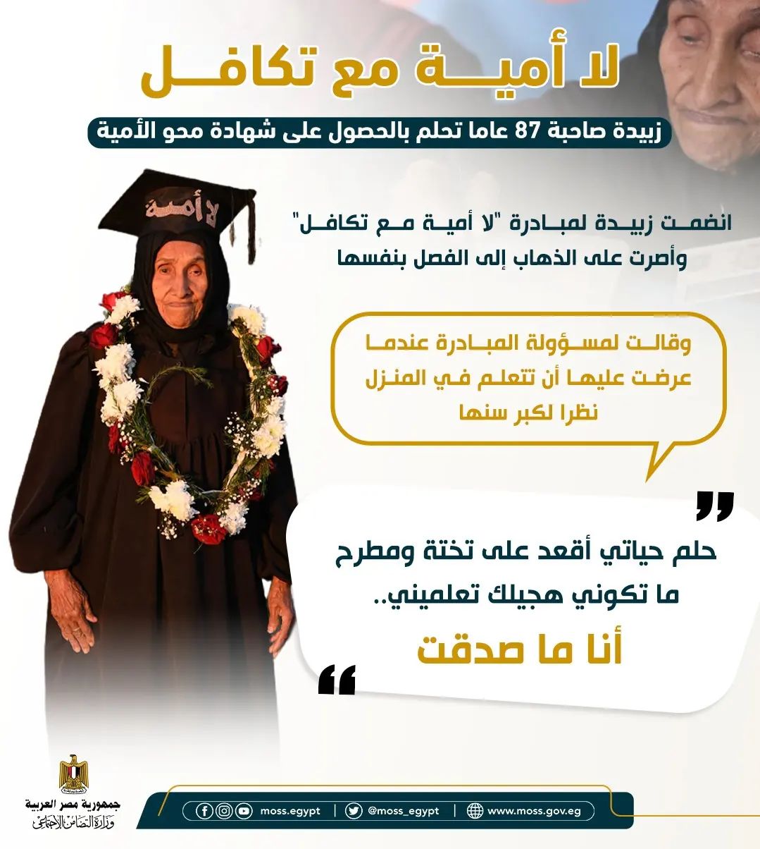 بدأت الحاجة زبيدة مسيرتها الدراسية منذ أشهر قليلة في إطار مبادرة «لا أمية مع تكافل» التي تنفذها وزارة التضامن الاجتماعي المصرية.