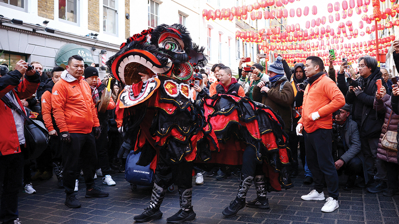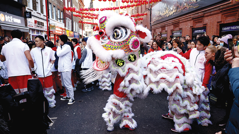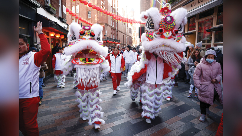 صينيون يحتفلون في بريطانيا بعيد رأس السنة القمرية الجديدة، إذ قدموا رقصة الأسد الصيني في الحي الصيني في لندن. وتستمر الاحتفالات برأس السنة القمرية، وهو أهم الأعياد في التقويم الصيني، 15 يوماً تتخللها حفلات وجلسات عائلية يتبادل خلالها الأقارب الهدايا والتذكارات.