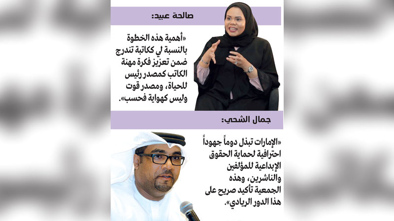 وقال الكاتب والناشر جمال الشحي، إن «الجمعية مكسب للمثقفين والكتاب والمبدعين عموماً، إذ تبذل الإمارات دوماً جهوداً احترافية لحماية الحقوق الإبداعية للمؤلفين والناشرين، ولاشك أن وجود هذه الجمعية اليوم تأكيد صريح على هذا الدور الريادي في دعم الإبداع، ومساهمة فاعلة في زيادة نشر الوعي بأهمية هذه الحقوق، وضبط عملية استخدامها عبر ربطها بتشريعات وقوانين واضحة تحاسب المخالفين».