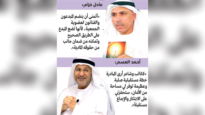 وأكمل خزام: «أتمنى أن ينضم المبدعون والفنانون ووكلاء الفنانين لعضوية هذه الجمعية، لأنها تضع المبدع على الطريق الصحيح وتمكنه على الأقل من ضمان جانب من حقوقه المادية المستحقة عن إبداعاته، كما أرى فيها نقطة ضوء جميلة آمل أن يتوسع مداها لتكون قادرة على تنفيذ أهدافها وخططها، ولربما كانت بعد سنوات قليلة لاعباً أساسياً وجوهرياً في ضبط عملية النشر على المستوى الإماراتي والعربي».