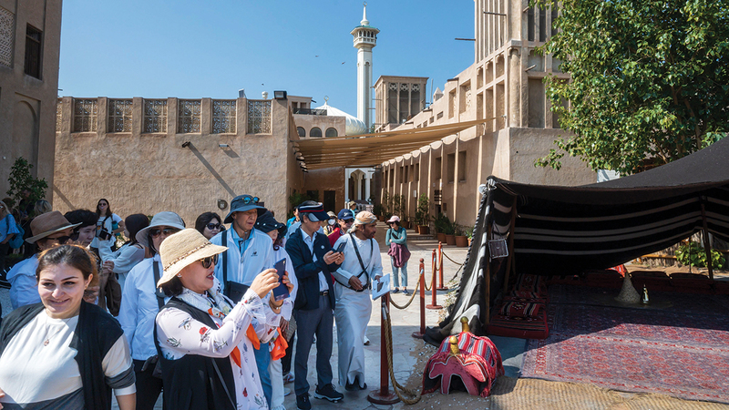 زوار في قلب دبي العريقة يطالعون ملامح من ماضي المدينة، حيث حي الفهيدي التاريخي، الذي لايزال يحتفظ بعبق الأمس، وخطى الأجداد، وشواهد المكان النابض بالحياة والحركة والتجارة منذ زمن بعيد على ضفاف الخور.