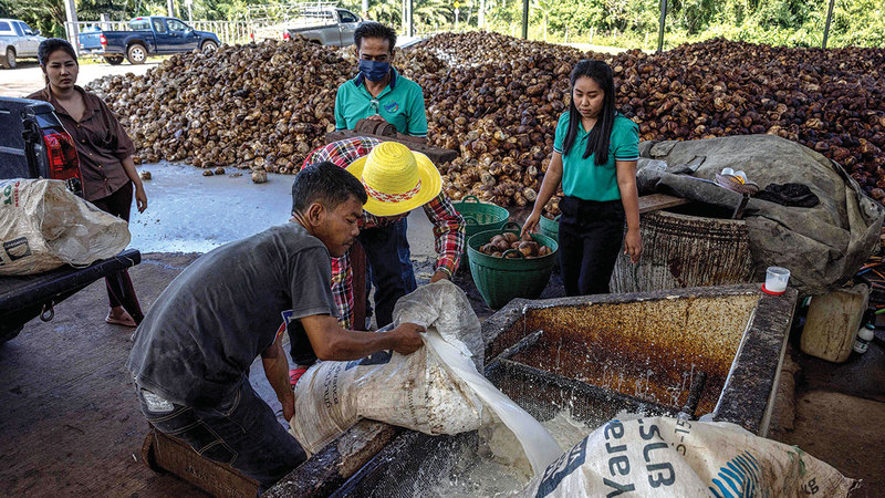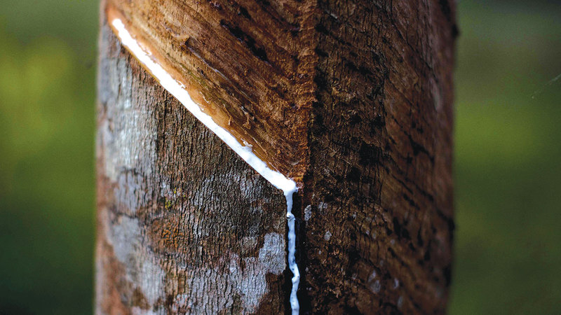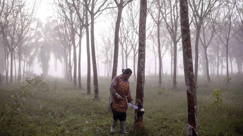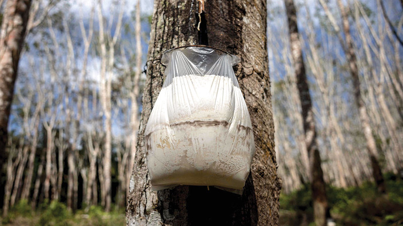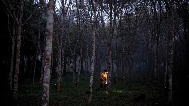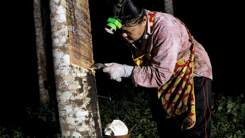 مزارع تايلاندي يستخدم كيساً بلاستيكياً لجمع مادة «اللاتكس» الطبيعي من شجرة في مزرعة مطاط في مقاطعة سورات ثاني جنوب تايلاند، قبل أن يقوم على إعدادها وتحريكها في وعاء كبير ليمنع تخثرها، وتايلاند هي أكبر منتج للمطاط الطبيعي في العالم، حيث توفر ما يقرب من 40% من المخزونات العالمية، لكن الأسعار المتراجعة والقواعد الجديدة القادمة بشأن المطاط المستدام، تخلق صعوبات مالية لمزارعي المطاط، في عمل هو صعب بالفعل ويعاني المزارعون والعاملون فيه مشكلات كثيرة.