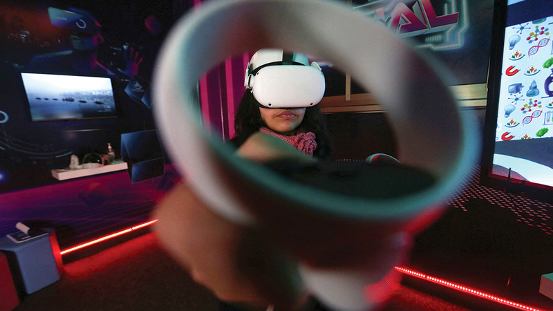 ينهمك طلاب مدرسة البسمة الحديثة في غزة، بتعلّم مكونات الخلية البشرية في بيئة ثلاثية الأبعاد، من خلال سماعات الرأس ومقابض خاصة بالواقع الافتراضي.