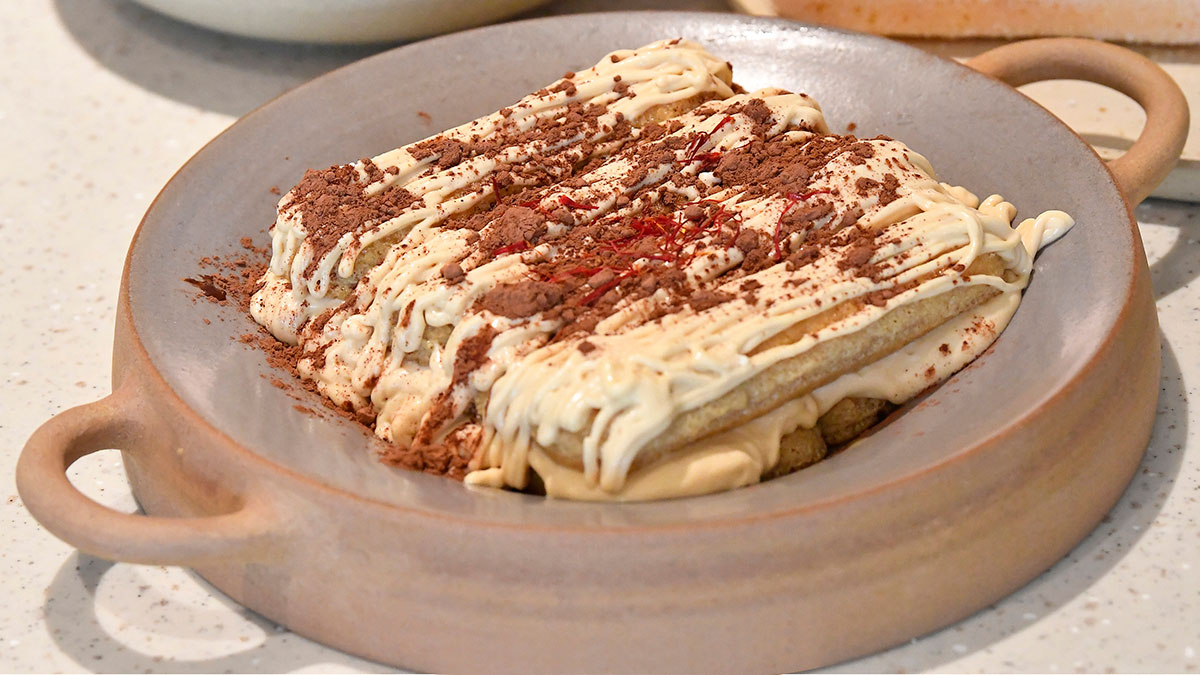 تعتمد هذه الوصفة على كريم بورليه، وهو نوع من الحلوى الغربية، مع إضافة النكهة العربية الأصيلة من خلال القهوة العربية والزعفران الذي يتسم إلى جانب طعمه المميز، بتأثيره في إنقاص الوزن.