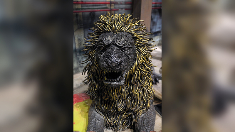 أما جيسوس إدواردو، فصنع الأسد الذي يعرض تحت عنوان «أسد من سلك»، من أسلاك حظائر الدجاج التي يزيد طولها على ميل، إذ قام بلف الأسلاك يدوياً لإنشاء التفاصيل المعقدة، دون اللجوء الى استخدام أي قالب للحصول على هذه التشكيلات. ويتلاعب مصمم القطعة بالظل والنور في التصميم، ما يمنح الأسد تدرّجات لونية ناجمة عن هذا الاختلاف في مصدر الضوء.
