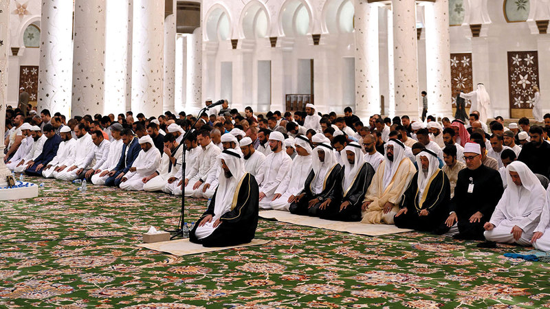 مصلون صاموا نهارهم، ويقيمون ليلهم، بصحبة كتاب الله، ليغتنموا بركات رمضان في رحاب جامع الشيخ زايد الكبير بأبوظبي، خلال الشهر الفضيل الذي وصل إلى منتصفه اليوم.