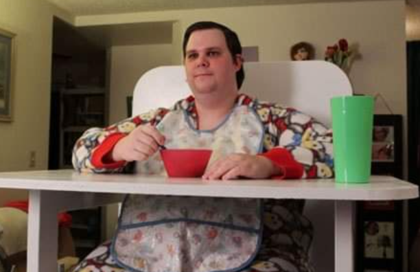 عاد لاستعمال رضاعة الحليب ووضع الحفاظات.. أميركي عمره 30 سنة يقرر العودة لعمر سنتين (صور)