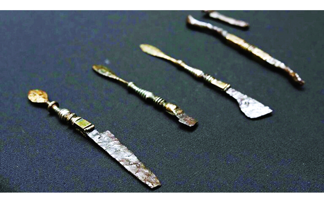 ويضيف الموقع: من ضمن الأدوات الجراحية التي عثر عليها العلماء مشارط مصنوعة من سبائك نحاسية مطلية بالفضة، وشفرات فولاذية قابلة للاستبدال، وملاقط وإبر وحجر خاص، ربما كان يستخدم لخلط مكونات الأدوية.