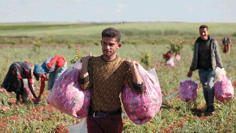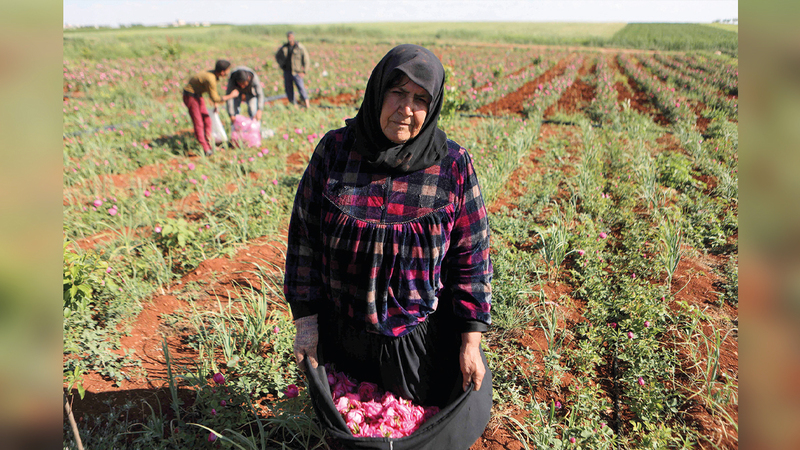 نساء سوريات يحصدن الورود في الحقول الزراعية القريبة من محافظة إدلب السورية، وتحظى الورود السورية بإقبال كبير من شركات عالمية، نظراً إلى نوعيتها الممتازة في تصنيع أنواع مختلفة من العطور، ويدخل الورد السوري في خطوط إنتاج الكثير من هذه الشركات.