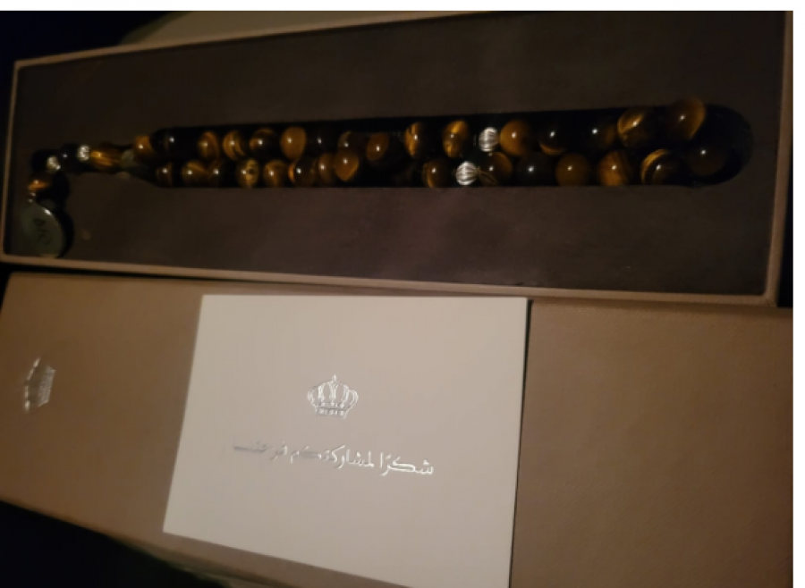 من جهة أخرى أهدى ولي العهد الأردني الأمير الحسين الضيوف الذين حضروا مأدبة العشاء بمناسبة زفافه "مسبحة" لكل ضيف.