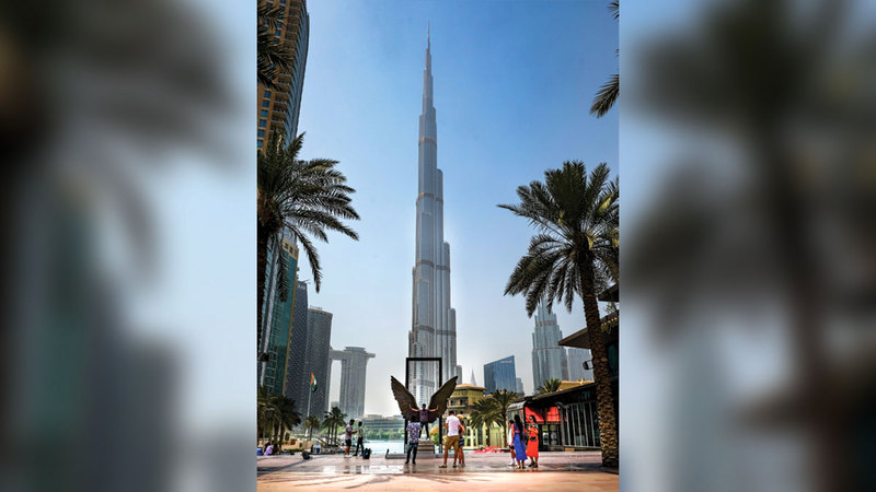 سياح وزوار يلتقطون صوراً تذكارية بجانب «برج خليفة»، المَعلم الشهير في دبي والعالم، الذي يقصده الزوار والسياح من جهات الأرض، للتعرف عن قرب إلى أعلى مبنى على سطح الكرة الأرضية.