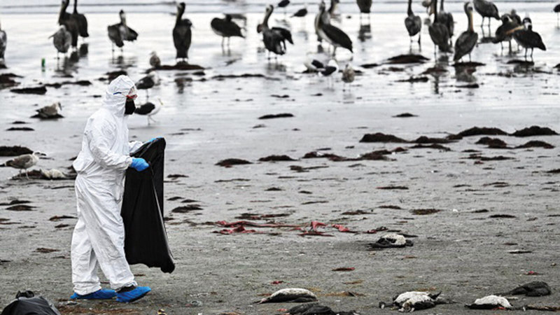 وعمل موظفون من إدارة الزراعة والثروة الحيوانية، يرتدون بزات واقية خاصة، على جمع مئات الطيور النافقة، التي كانت تنتشر على شواطئ كوكيمبو، على بعد نحو 400 كيلومتر إلى الشمال من العاصمة سانتياغو، وهي منطقة سياحية تضم فنادق ومطاعم وكازينوهات.