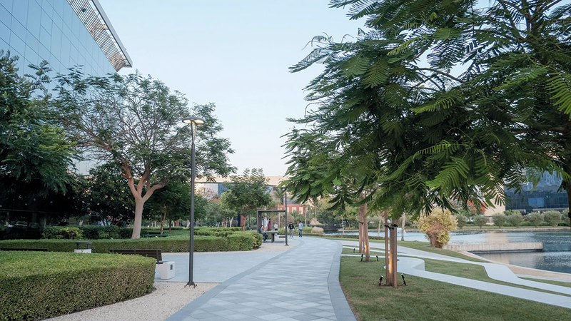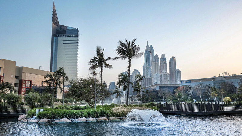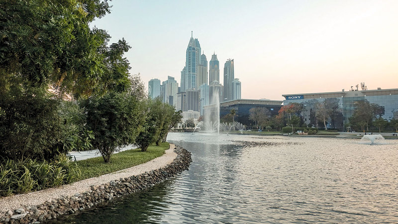 في كل بقعة من دبي استراحات تبهج العين، وتسعد القلب.. مساحات صديقة للبيئة، مكسوّة بالماء والخضرة والنخيل ومعالم الحُسن والجمال من كل الجهات.. كما الحال هنا في هذه الاستراحة بقلب «مدينة دبي للإنترنت».